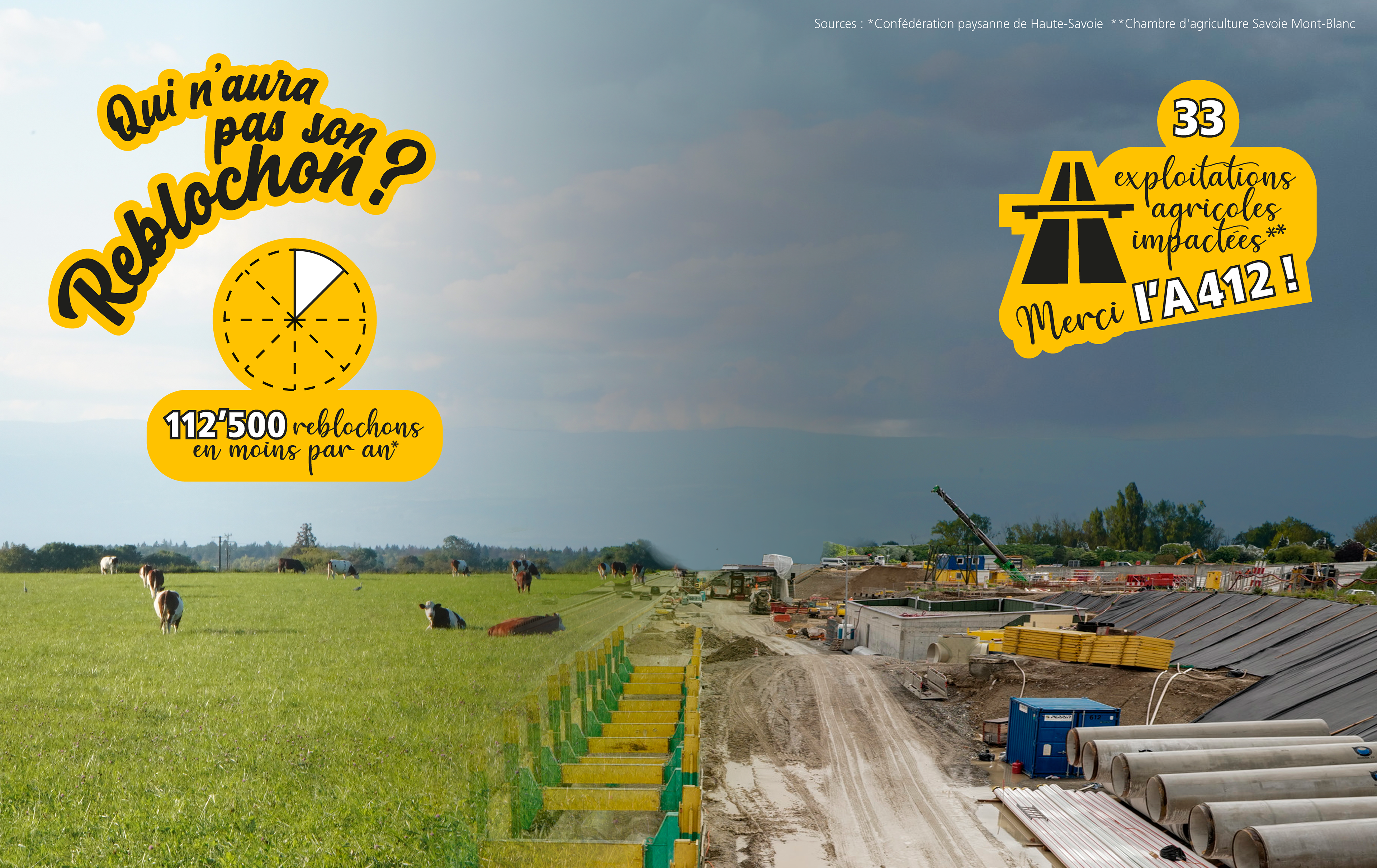 La construction de l’autoroute aura un impact significatif sur l’agriculture de la région. Elle provoquera d’abord la perte de plus de 70 ha de surfaces agricoles(2). Elle impactera 33 exploitations et représentera une perte nette de près de 112’500 reblochons AOP selon les calculs de la Confédération paysanne de Haute-Savoie. La question agricole représente donc un enjeu central qui, à lui seul, devrait permettre d’illustrer l’irrationalité du projet de l’autoroute A412 à l’échelle du territoire.